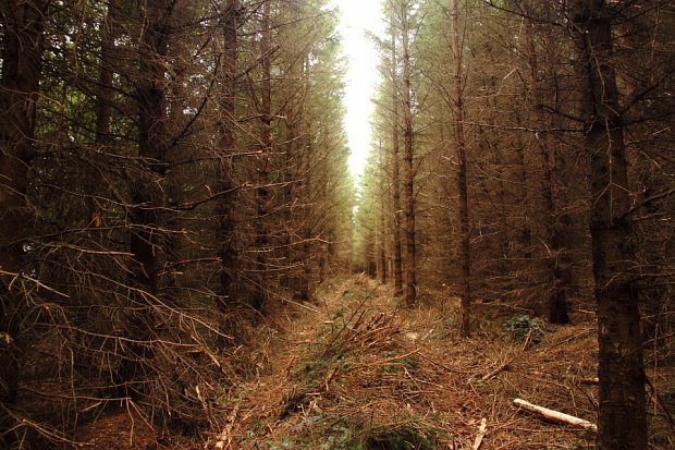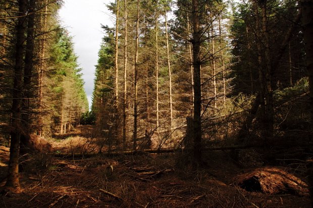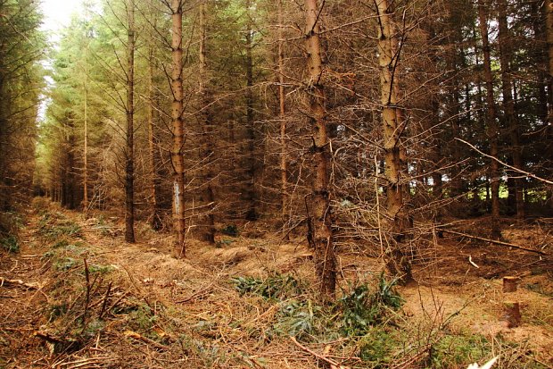 Below are some photo's comparing a woodland which has been thinned by large forestry machinery and a woodland that we thinned with our own machinery.  The woods are the same age and planted in the same manner, (deep ploughing and 1.8m spacing).  The large machinery had to take out two rows of trees which has opened it up greatly and has removed a large percentage of trees.  Our machinery has only removed a single row of trees for access and selectively removed poorer trees from the remaining rows.  This has double benefits of leaving a more complete canopy whilst also giving a more selective thin of predominantly weaker trees throughout the whole woodland.