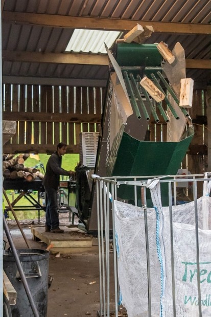 The timber is brought from the woods to our stacking yard where it is stacked for several months to start drying. It is then transferred to our modern firewood processors which cut and split the wood and then transfer the logs into bags. The guys in the processing yard do their best to split the logs into even sizes to fit into most stoves but given the nature of the trees that we use, with bends, twists and knots this can be a tricky process.