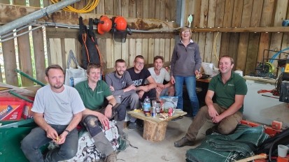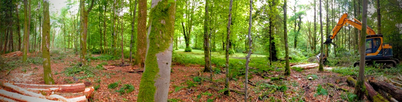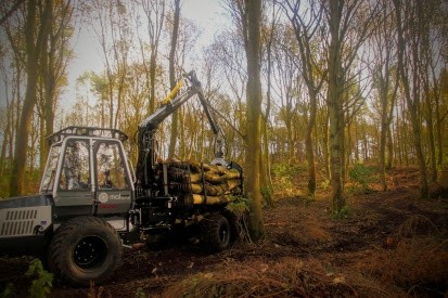 When thinning woods we select and cut the the weaker trees and those of poorer form or target the dominant species. This encourages better diversity within the woodlands and also lets more light in which helps the remaining trees to thrive, as well as benefitting ground floura and fauna and in many cases allowing an understory to develop. These things all lead to more healthy, diverse and resilient woods for the furure. Once the trees have been cut we extract the timber using our purpose-built low ground pressure machinery to ensure minimal ground damage or damage to the remaining trees. This timber is stacked ready for uplift to bring it back to our yard.